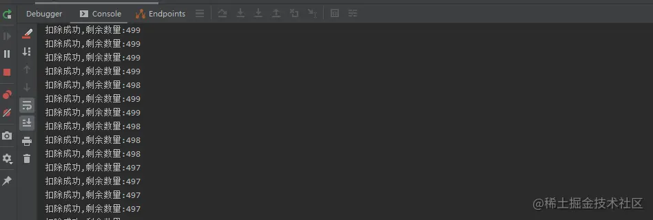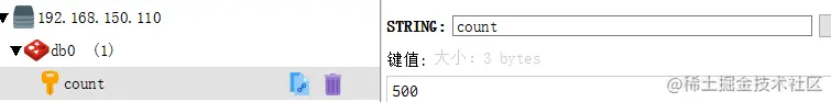 @RequestMapping("redisTest") public String redisTest() { String key = "count"; //获取库存数量 int count = Integer.parseInt(stringRedisTemplate.opsForValue().get(key)); //有库存减少 if (count > 0) { count = count - 1; stringRedisTemplate.opsForValue().set(key, String.valueOf(count)); System.out.println("扣除成功,剩余数量:" + count); } else { System.out.println("扣除失败"); } return "end"; } - 当前redis count的值为500