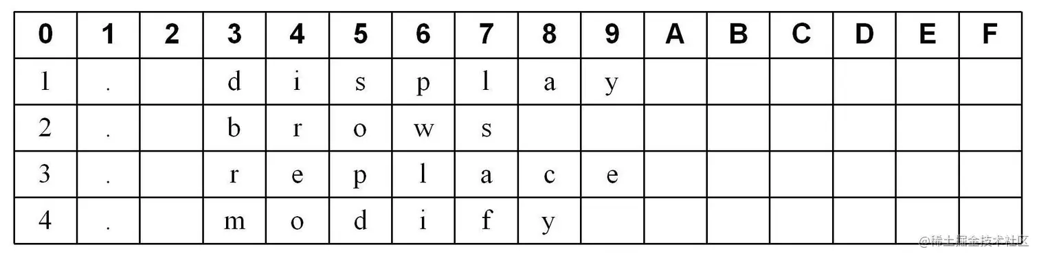在数据段中,字符串后面部分使用空格填充至 16 字节,其在内存中以如下方式组织: