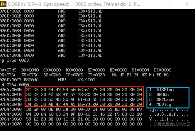 上述代码中,si 用于辅助从 data 段取四字节的数据,每次偏移量为 4 字节;di 用于辅助从 data 段取两字节的数据,每次偏移量为 2 字节;bp 用于索引表格中的每一行数据,每次偏移量为 16 字节。最后,在外层加上循环量为 21 的循环,整体代码为: