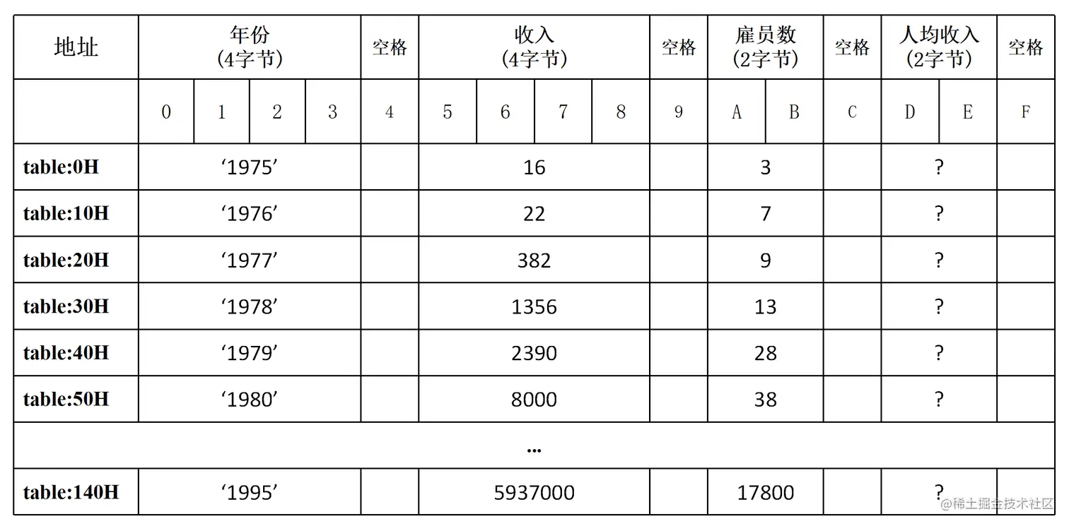 雇员字段使用两个字节表示,使用一个 mov 语句即可。雇员部分的数据相对于年份的偏移为 21×4=84 字节;在 table 段,雇员部分的数据相对于年份的偏移为 10 字节。该部分代码为: