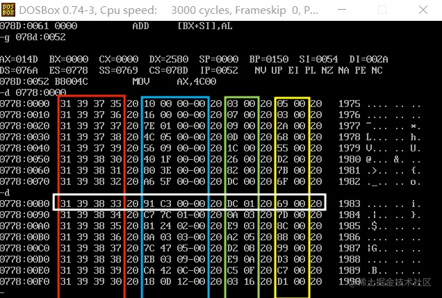 采取每一项单独分析,最后合并的思路。首先往 table 段写入表示年份的字符串,每一项用四个字节表示。考虑每次写入一个字,使用两个连续的 mov 指令即可。该部分代码为: