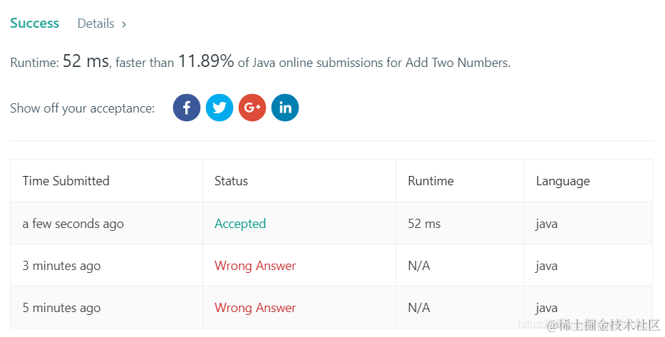 注意测试,第一次提交忽略了当l1或l2为空时,直接加和会有空指针错误。第二次是因为没有测试最后进位,如5+5=10,最后carry为1,但是由于已经结束循环,故需在后面加上最后进位。