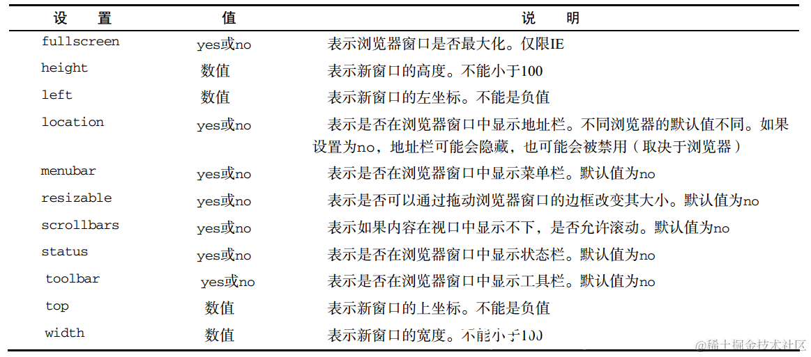 如果给 window.open()传递的第二个参数并不是一个已经存在的窗口或框架,那么该方法就会根据在第三个参数位置上传入的字符串创建一个新窗口或新标签页。如果没有传入第三个参数,那么就会打开一个带有全部默认设置(工具栏、地址栏和状态栏等)的新浏览器窗口(或者打开一个新标签页——根据浏览器设置)。在不打开新窗口的情况下,会忽略第三个参数。