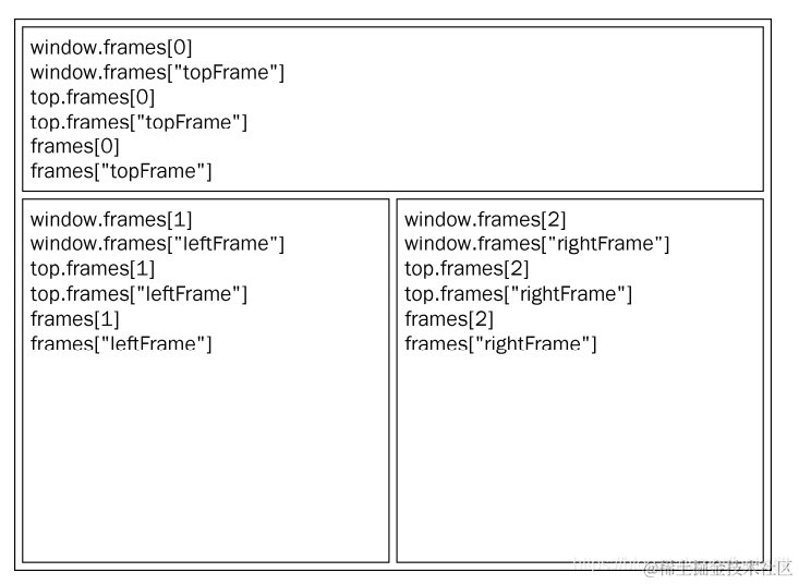 如果页面中包含框架,则每个框架都拥有自己的 window 对象,并且保存在 frames 集合中。在 frames集合中,可以通过数值索引(从 0 开始,从左至右,从上到下)或者框架名称来访问相应的 window 对象。每个 window 对象都有一个 name 属性,其中包含框架的名称。