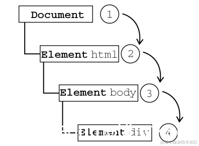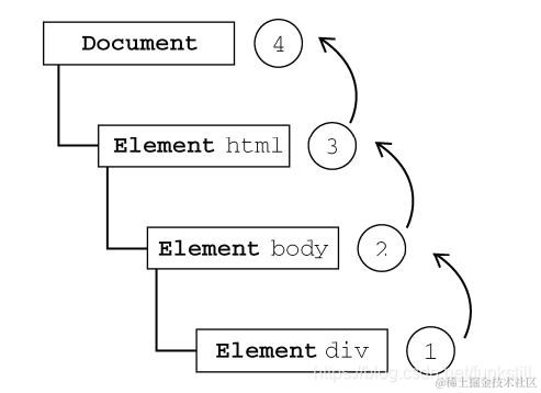 即事件开始时由最具体的元素(文档中嵌套层次最深的节点)接收,然后逐级向上传播到较为不具体的节点(文档)。
