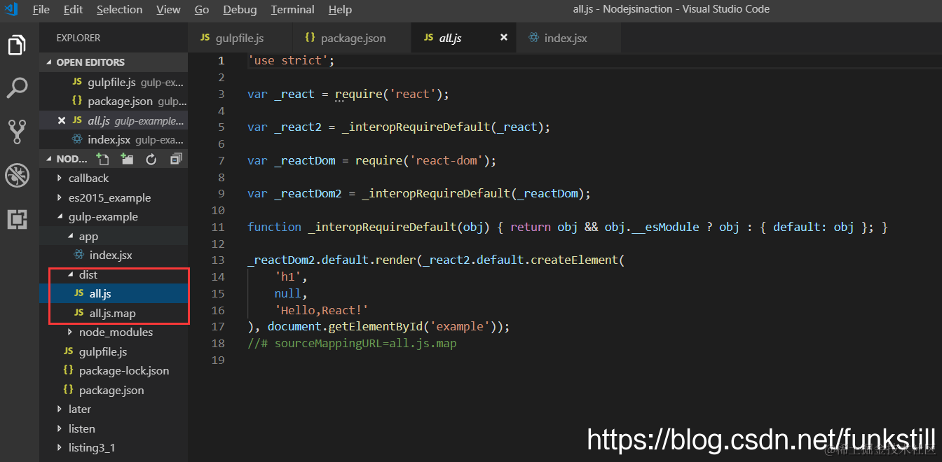 打开这个文件。现在用 Gulp 构建一个小型的 React 项目。这里会用到 gulp-babel、 gulp-sourcemaps和 gulp-concat: