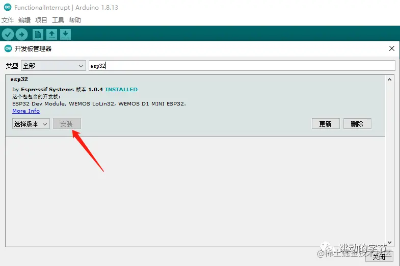 - 添加开发板,在工具->开发板->开发板管理中,搜索esp32,如下图所示,安装Arduino core for esp32,过程可能比较慢,也可能需要科学上网才能安装好