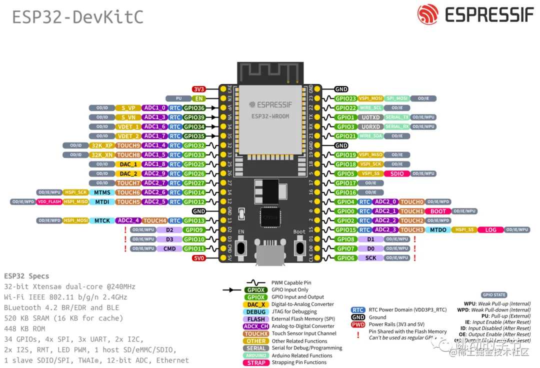 引脚图,初期开发我们就用ESP32-DevKit开发板,便宜好用。