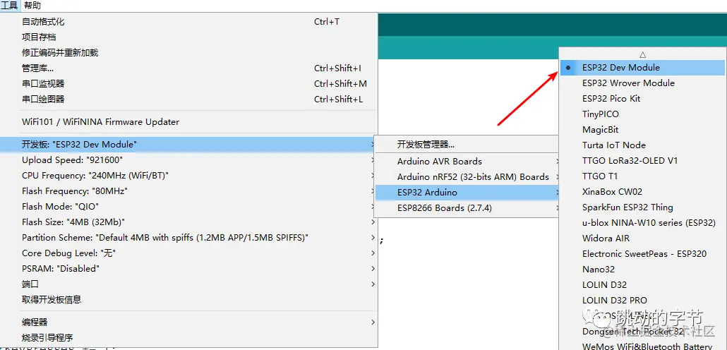 - 然后选择中对应的开发板,我们可以看到这里有很多不同的ESP32开发板,这里选择ESP32 Dev Module就可以了
