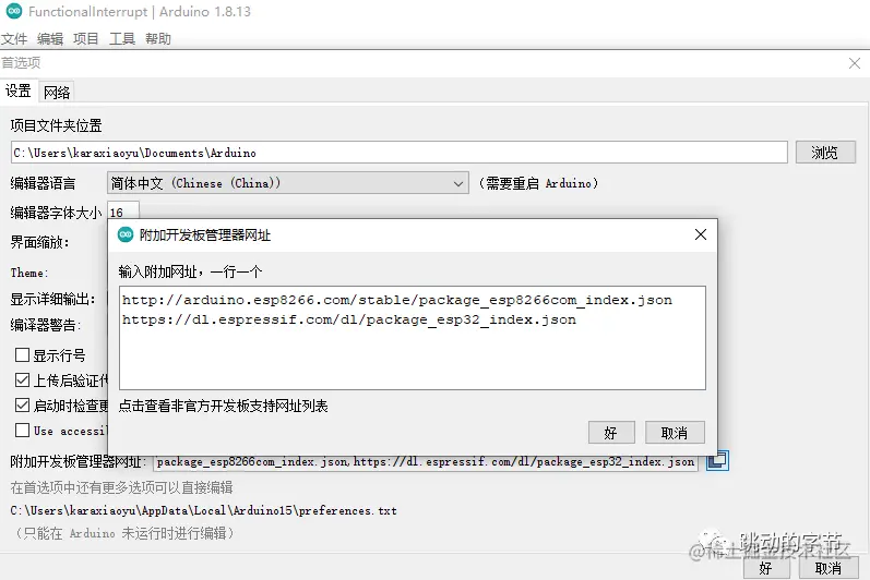 https://www.arduino.cc/en/software - Arduino IDE中添加对应开发板,在文件->首选项->附加开发板管理网址中,添加ESP32的管理网址: