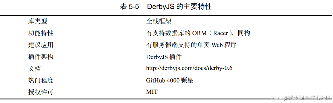 DerbyJS 有数据库模型 API 和数据同步 API。你可以用它搭建单页 Web 程序和现代化的实时程序。因为它自带对 WebSocket 和同步的支持,所以不用我们费心去选择 WebSocket 库,或者如何在服务器端和客户端之间同步数据。