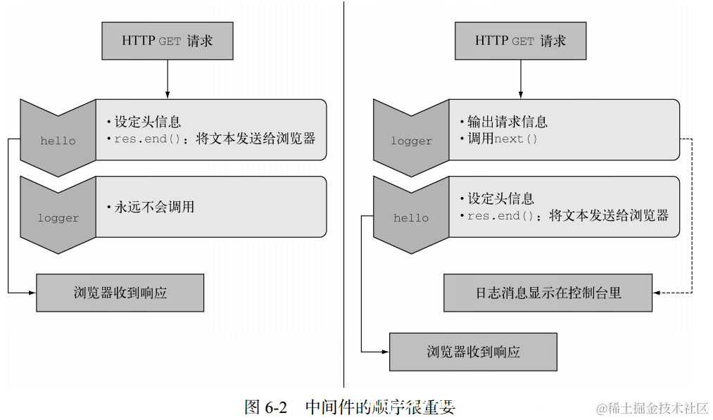 中间件的顺序会对程序的行为产生显著影响。漏掉 next()能停止执行,也可以通过组合中间件实现用户认证之类的功能。