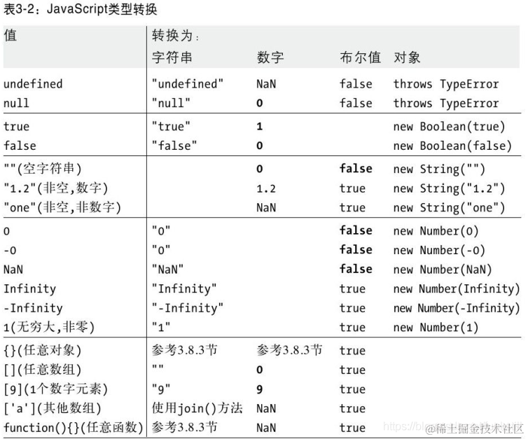 JavaScript中的取值类型非常灵活,我们已经从布尔值看到了这一点:当JavaScript期望使用一个布尔值的时候,你可以提供任意类型值, JavaScript将根据需要自行转换类型。一些值(真值)转换为true,其他值(假值)转换为false。这在其他类型中同样适用:如果JavaScript期望使用一个字符串,它把给定的值将转换为字符串。如果JavaScript期望使用一个数字,它把给定的值将转换为数字(如果转换结果无意义的话将返回NaN)