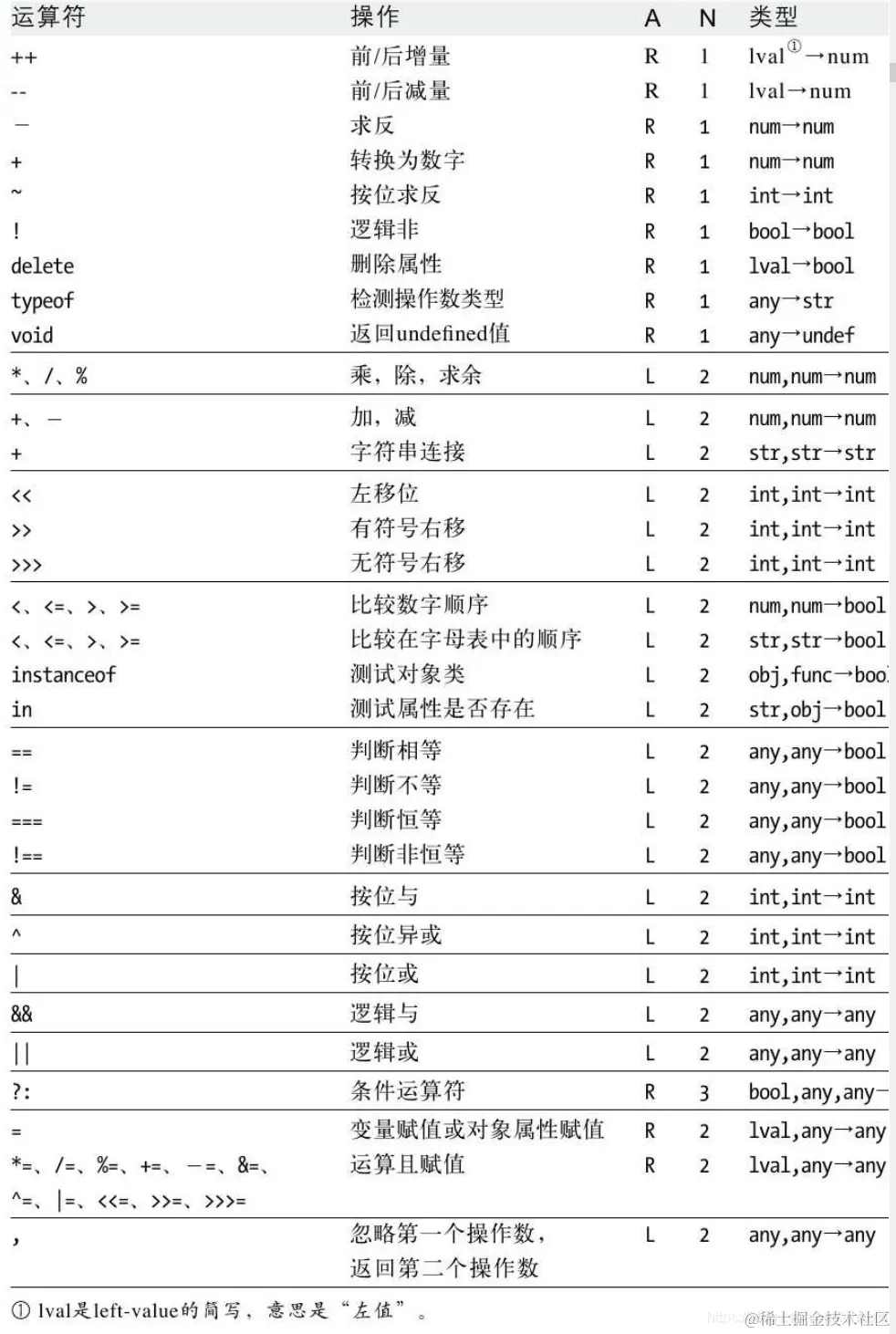 递减“-”运算符的操作数也是一个左值。它把操作数转换为数字,然后减1,并将计算后的值重新赋值给操作数。和“++”运算符一