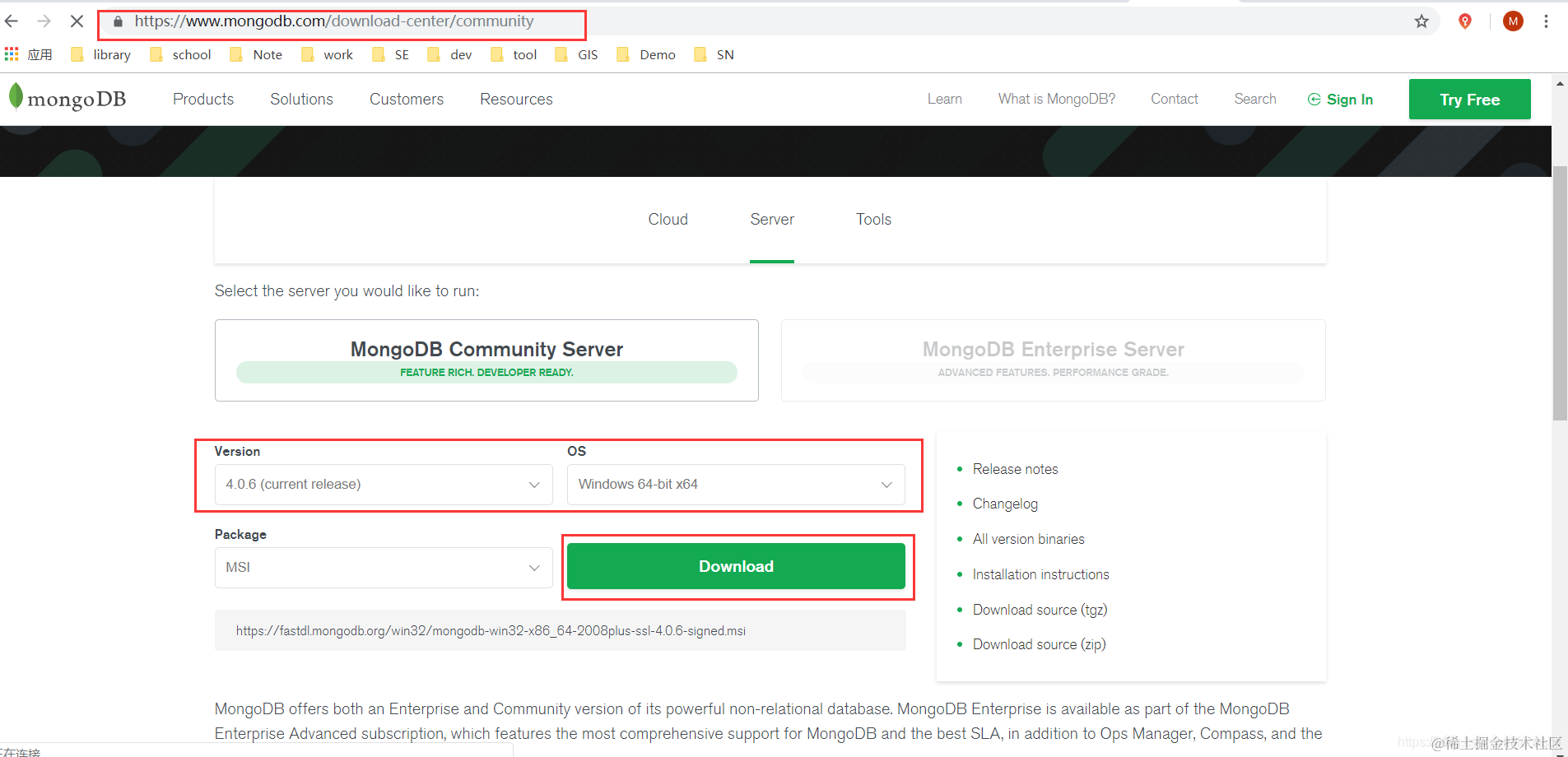 MongoDB安装win平台(含快速下载链接) cellinlab 2022-04-27 130 阅读1分钟 安装包下载 www.mongodb.com/download-ce… 快速链接:MongoDBWin安装包win32-x86_64-2008plus-ssl-4.0.6 安装