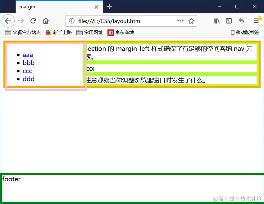 <section>section 的 margin-left 样式确保了有足够的空间容纳 nav 元素。</section>