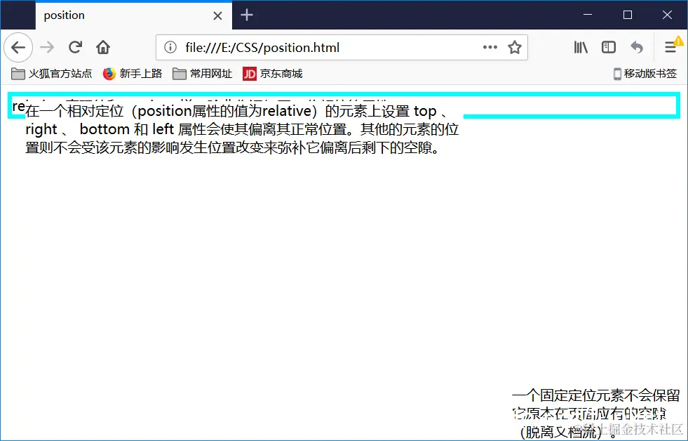 元素可以使用的顶部,底部,左侧和右侧属性定位。然而,这些属性无法工作,除非是先设定position属性。他们也有不同的工作方式,这取决于定位方法。