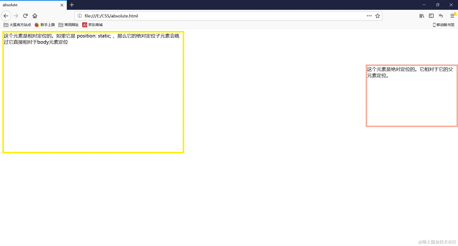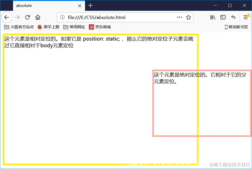 <div class="absolute">这个元素是绝对定位的。它相对于它的父元素定位。</div>