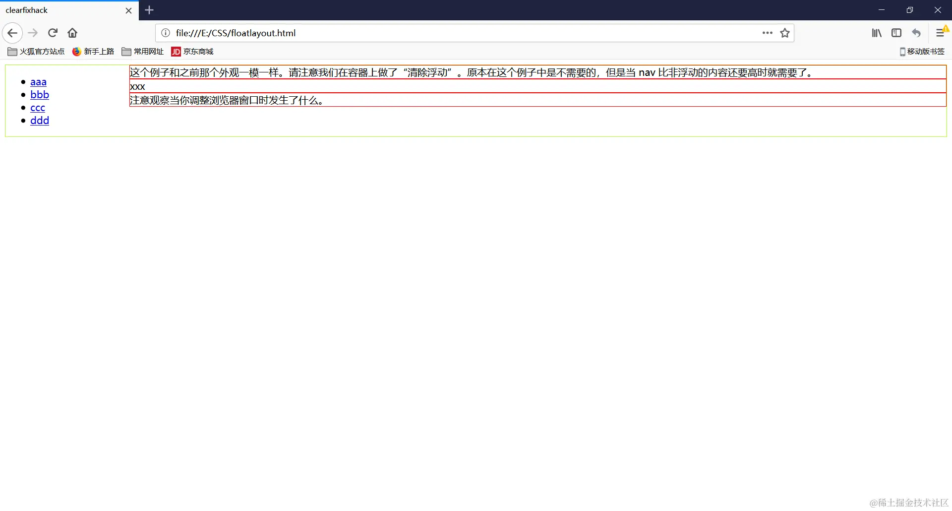 <section>这个例子和之前那个外观一模一样。请注意我们在容器上做了“清除浮动”。原本在这个例子中是不需要的,但是当 nav 比非浮动的内容还要高时就需要了。</section>