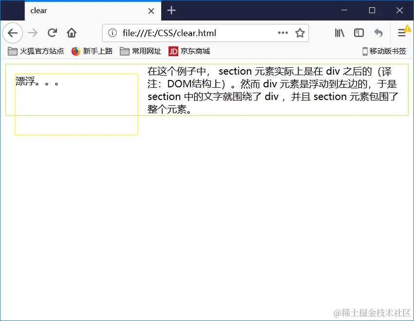 在这个例子中, section 元素实际上是在 div 之后的(译注:DOM结构上)。然而 div 元素是浮动到左边的,于是 section 中的文字就围绕了 div ,并且 section 元素包围了整个元素。