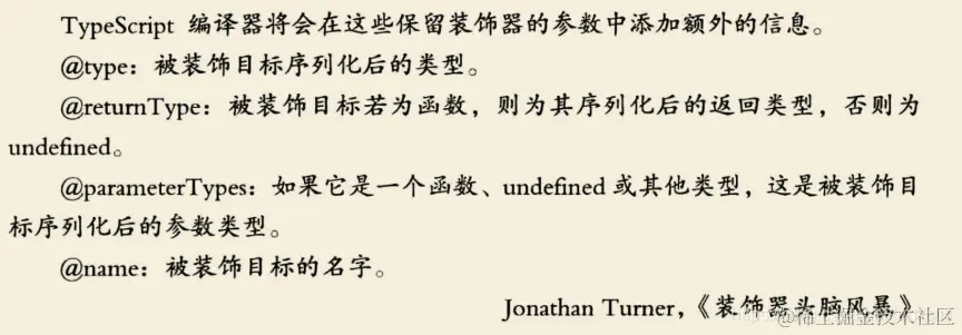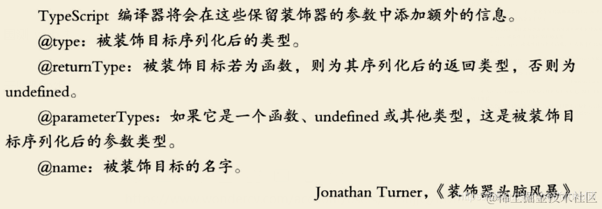 不久后,TS团队决定使用反射元信息API来替代这些保留装饰器。他的思想与使用保留装饰器十分相似,但使用了反射元信息API代替保留装饰器,来获取元信息。TS文档中定义了三种保留元数据键:
