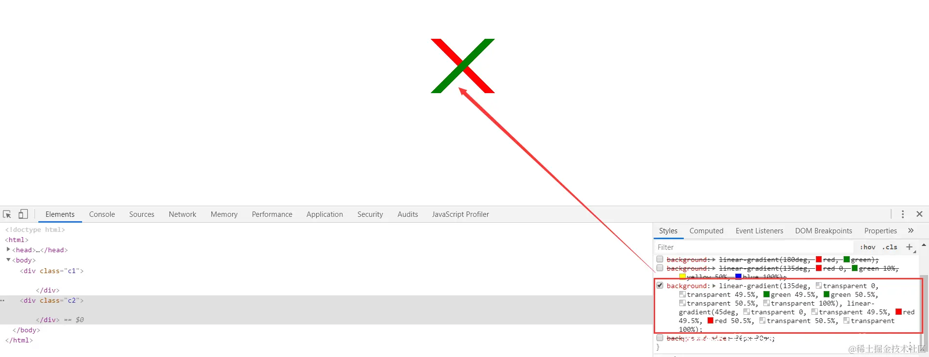 background: linear-gradient(135deg, transparent 0, transparent 49.5%, green 49.5%, green 50.5%, transparent 50.5%, transparent 100%),