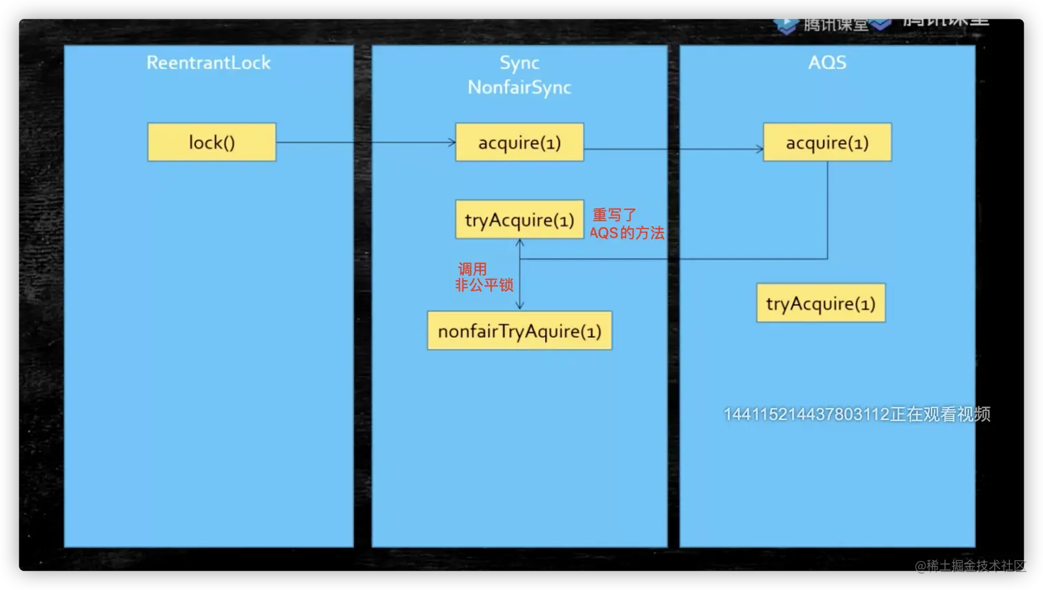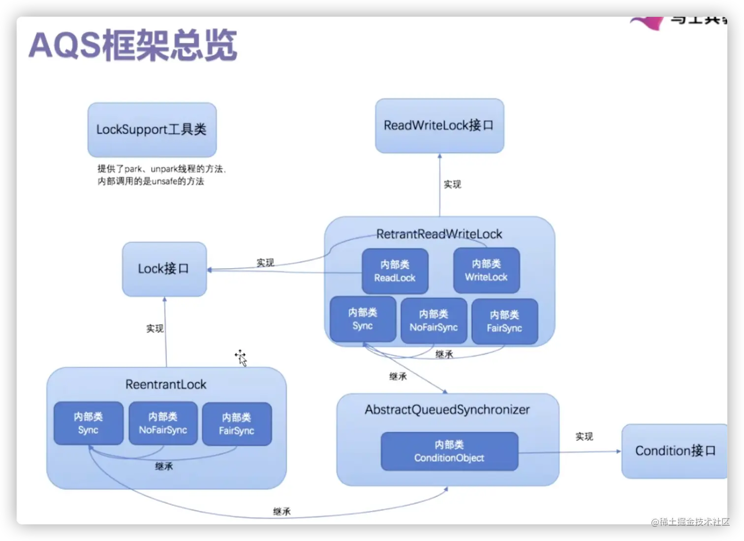 - 独占锁的原理是如果有线程获取到锁,那么其它线程只能是获取锁失败,然后进入等待队列中等待被唤醒。