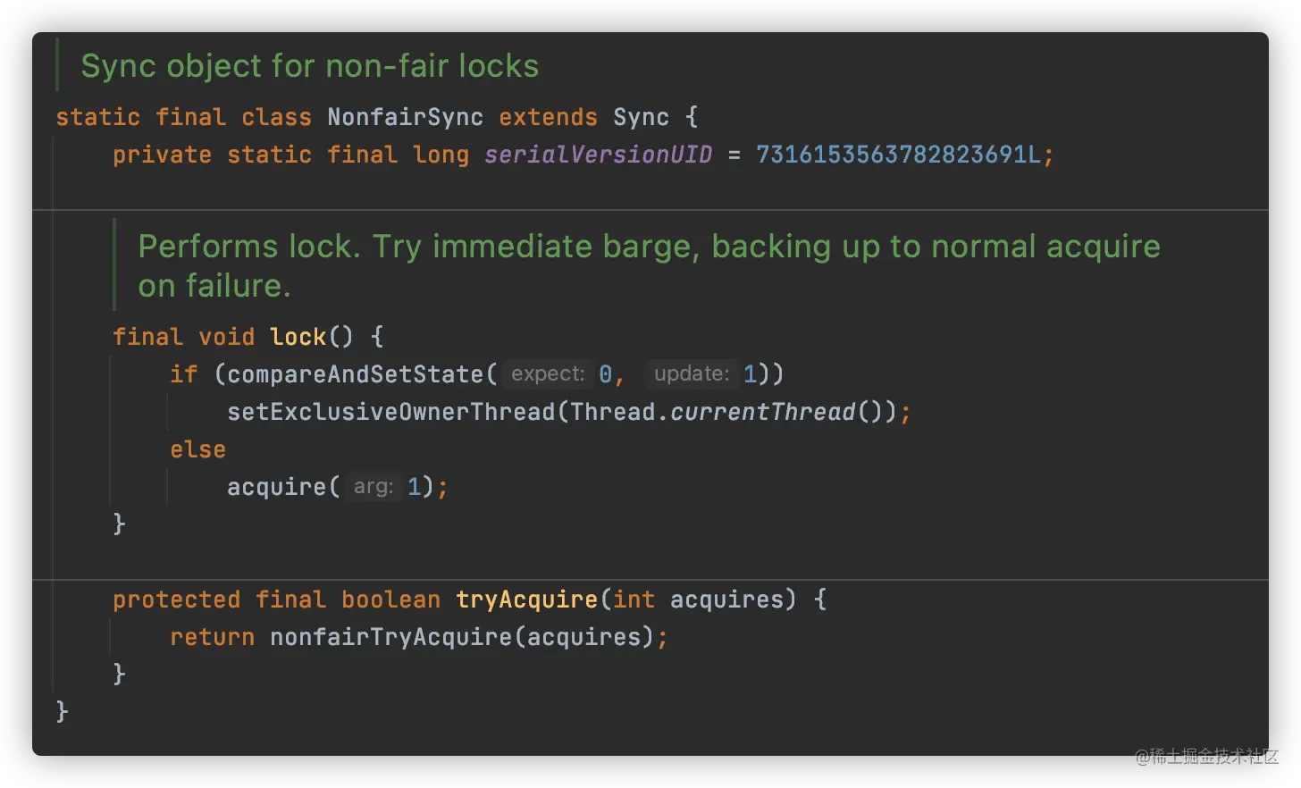 - 非公平锁在 CAS 失败后,和公平锁一样都会进入到 tryAcquire 方法,在 tryAcquire 方法中,如果发现锁这个时候被释放了(state == 0),非公平锁会直接 CAS 抢锁,但是公平锁会判断等待队列是否有线程处于等待状态,如果有则不去抢锁,乖乖排到后面。
