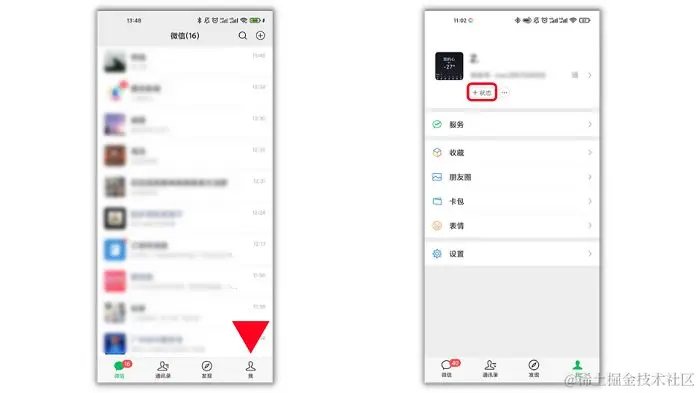 第1步:进入微信后点击【我】,随后进入“状态”的设置;