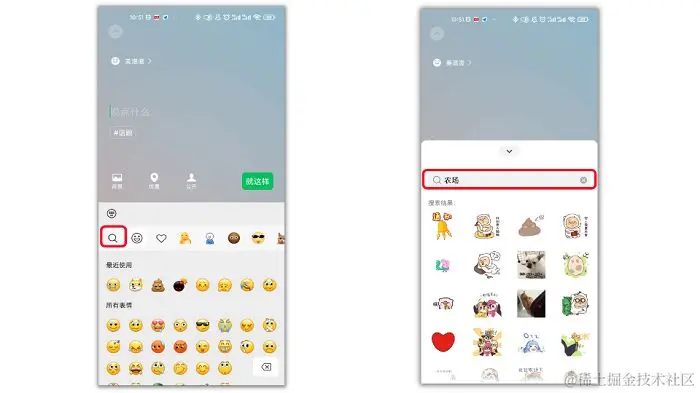 第3步:使用表情里的搜索功能,输入“农场”二字后搜索;