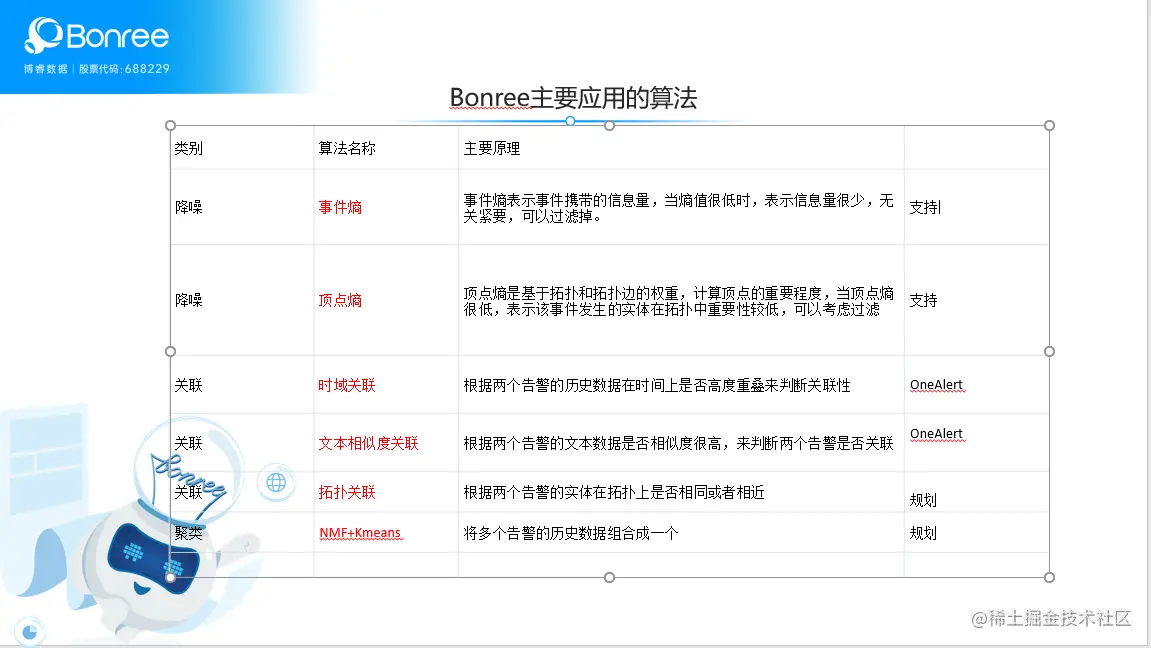 目前,博睿数据在告警收敛方面应用及规划使用的的算法包括事件熵、顶点熵、时域关联、文本相似度关联、拓扑关联、NMF+Kmeans等