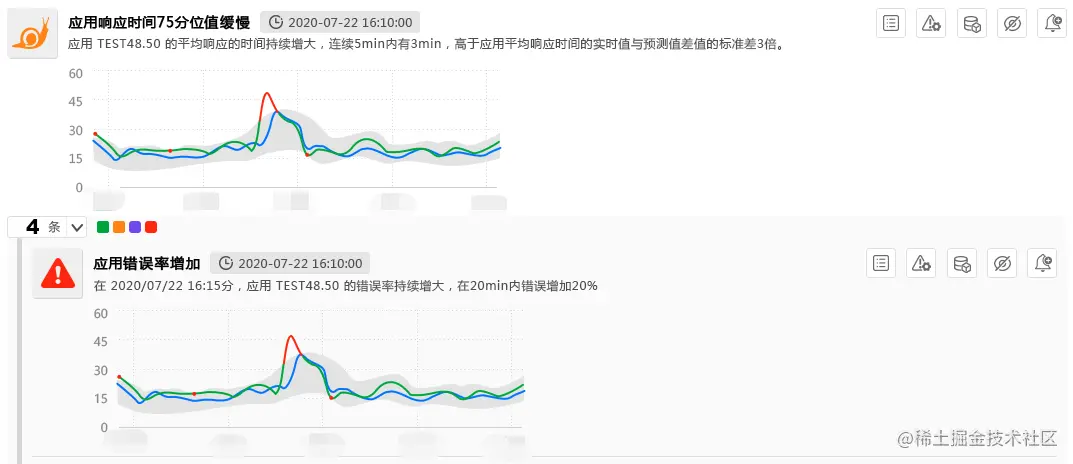IT运维人员在对应用服务运行状态的检测过程中,通过AIOps的异常检测算法,可以判断图中红色区域的数据即为异常数据,深灰色条状区域为可容忍的业务波动范围。同时,运维人员也可以通过数据集特征数据,对当前时段内数据进行事件聚合,全面分析当前事件对应用的全部影响波动范围。