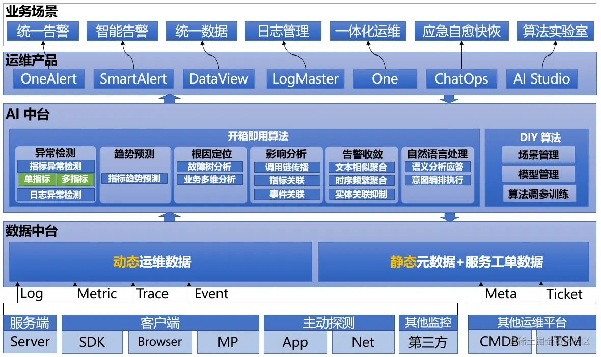 2016年,Gartner面向运维提供了一个新概念——“AIOps”,中文释义智能运维。即其是以AI等手段为核心,为运维提供更为智能和数字化的支撑。也就是说,把运维从“人”的要素抽离出来,更多的放到“数据”一侧。其中包含的场景更加丰富,包括异常告警、告警收敛、故障分析、趋势预测、故障画像等等。