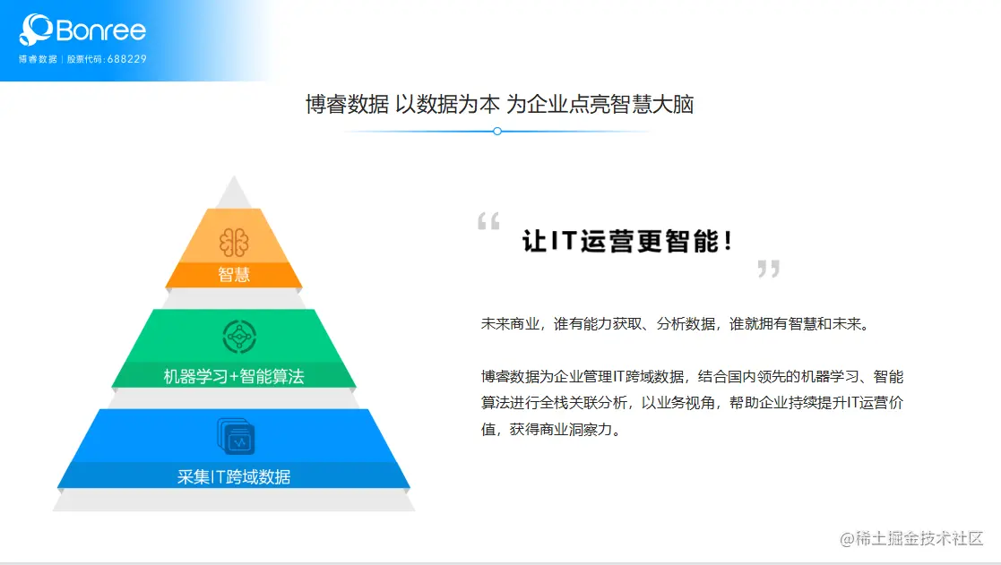 作为领先的APM应用性能管理厂商,在AIOps实践方面,多年来博睿数据积极拥抱人工智能、机器学习等新技术变革的浪潮,并基于AI和机器学习技术,自主研发了“数据接入、处理、存储与分析技术”核心技术体系,全面布局智能基线、异常检测、智能告警、关联分析、根因分析等丰富且广泛的智能运维功能,并将AIOps能力融入端到端全栈监控产品线,可为传统企业提供强大的数据处理、存储和分析的软件工具,帮助客户整合各类IT运维监控数据,实现数据的统一存储和关联分析,打破数据孤岛,构建统一的IT运维管理平台,让企业的IT运维更加智能化、自动化。