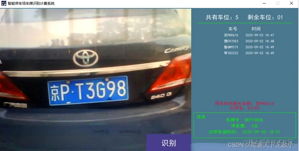 然后是怎么收费的,五块一小时还是三块,三小时怎么计算,相对而言比单纯的识别车牌又增加了一定的难度,那么今天也是实现大部分停车场的一个计费系统原理。可能它不是Python写的,但是肯定是一门编程语言来实现的。所以今天就教大家如果实现后续的计费系统。附完整代码,需要的拉到文末即可。