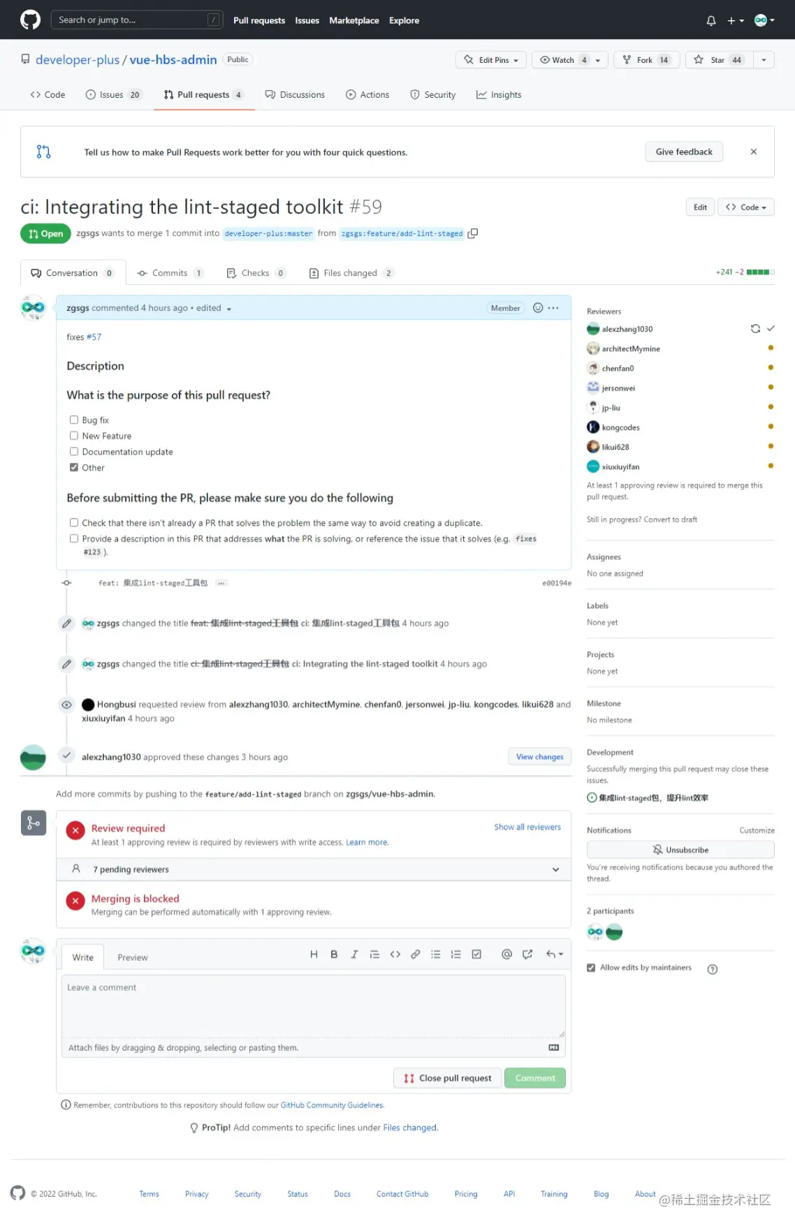 新建PR后,需要管理员进行Review,这个过程往往需要反复几次意见修改才能通过