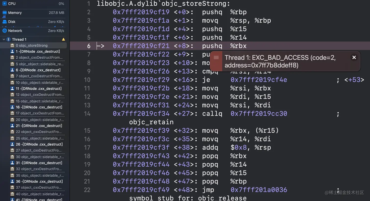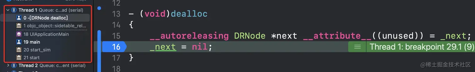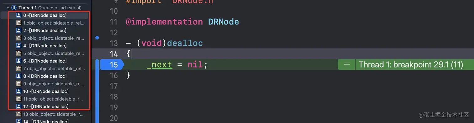 原因:头结点析构后会释放自身持有的属性(cxx_destruct,这里不去讲dealloc的流程 网上有很多优秀的帖子)导致next指向的node析构...不停的析构导致stack overflow引发的EXC_BAD_ACCESS