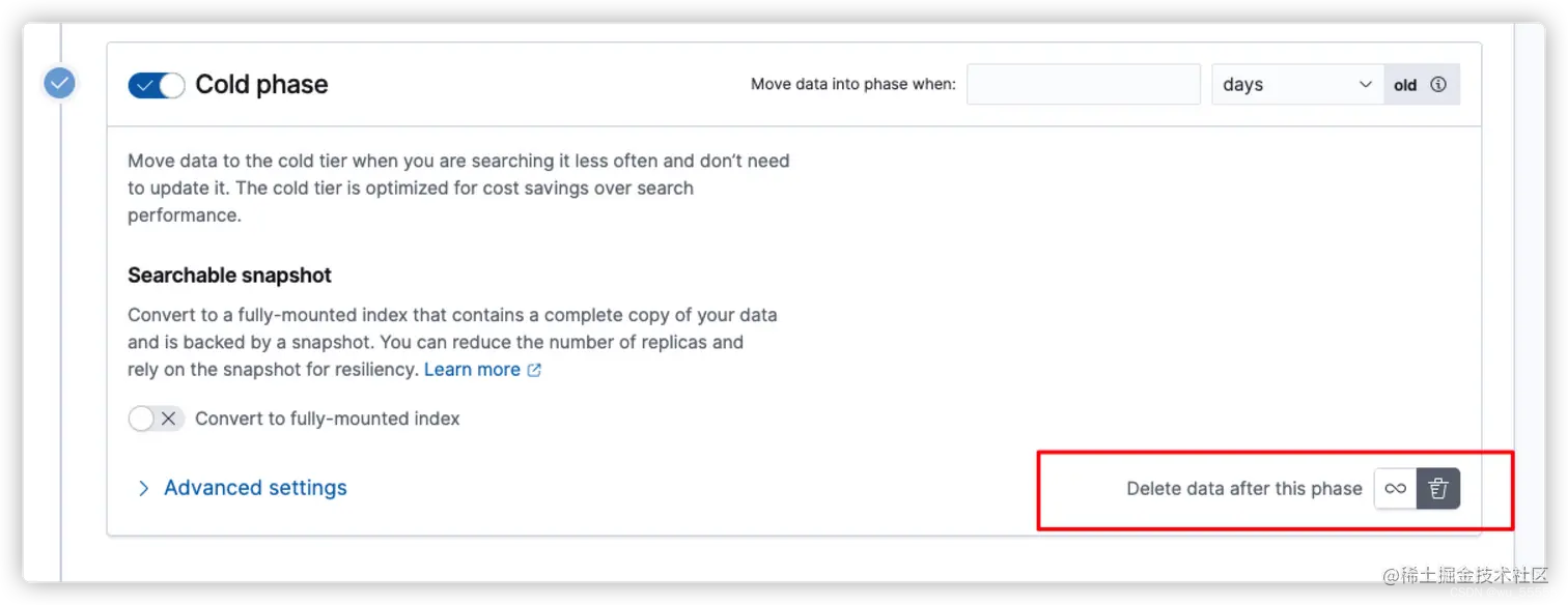 除了hot节点,其他的节点都是默认关闭的,需要手动打开,这里输入的move data into phase when就是该节点的min_age,也就是rollover触发后多少时间后转移到这个节点