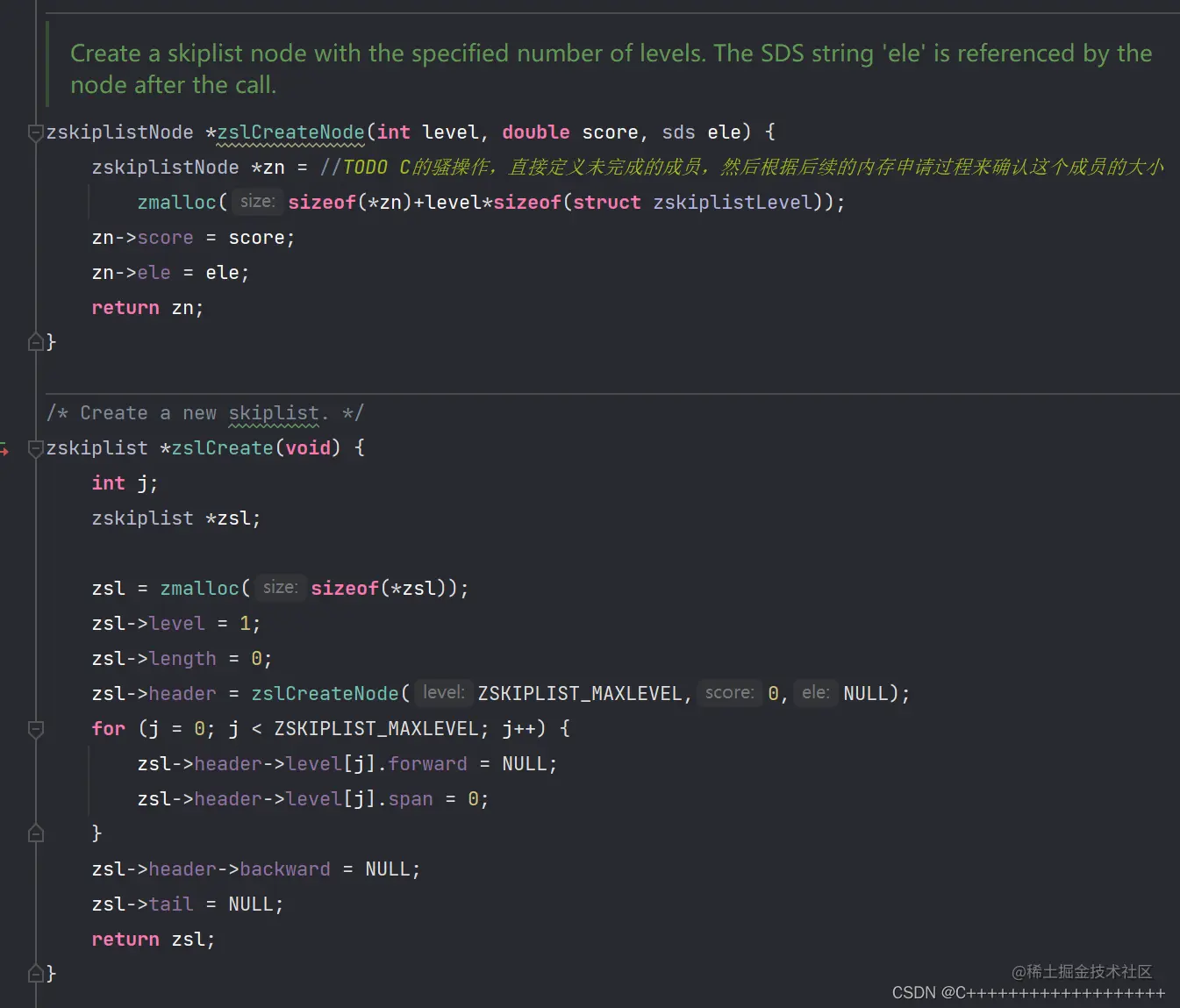 创建函数,这时前面定义的level[]类型的优势就体现出来了,在C中这个类型算是未完成的类型,所以需要根据你给它分配的内存来进行具体的使用,没有分配内存前,你可以sizeof(zskiplistNode);试一试,你会发现level不计内存!