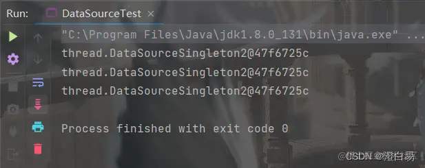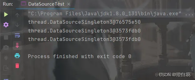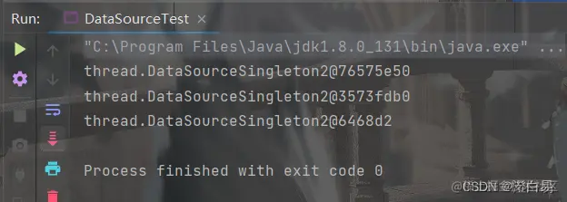 可以看到产生了三个实例,而非一个,线程不安全。这种方式只能在单线程下使用。如果在多线程下,一个线程进入了if (dataSource == null)判断语句块,还未来得及往下执行,另一个线程也通过了这个判断语句,这时便会产生多个实例。所以在多线程环境下不可使用这种方式。