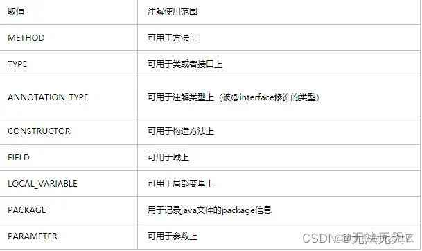 @Target 用于描述注解的使用范围,被描述的注解可以用在什么地方,参数