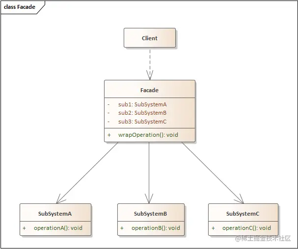 Facade:外观角色提供了一种访问特定子系统功能的便捷方式。SubSystem:子系统不会意识到外观角色的存在,它们在系统内运作并且相互之间可直接进行交互。Client:使用外观角色代替对子系统对象的直接调用。