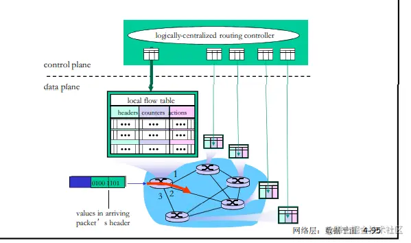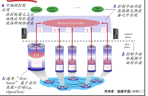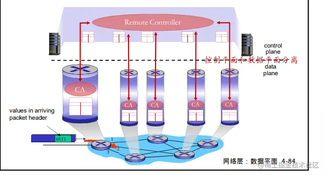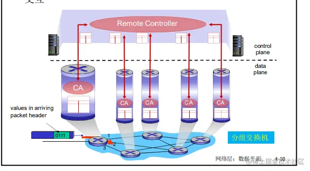 一个不同的(通常是远程)控制器和CA交互,控制器决定分组 转发的逻辑(可编程),CA所在设备执行逻辑。