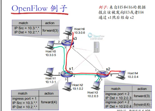 - 路由器中的流表定义了路由器的匹配+行动规则(流表由控制器计算并下发)