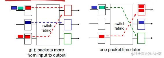 当交换机构的速率小于输入端口的汇聚速率时, 在输入端口可能要排队