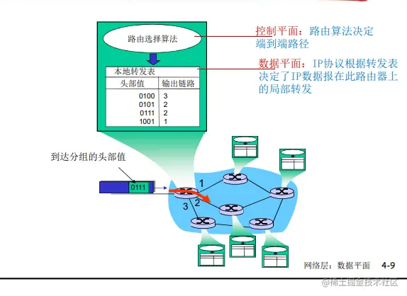 - IP转发:对于到来的分组按照路由表决定如何转发,数 据平面