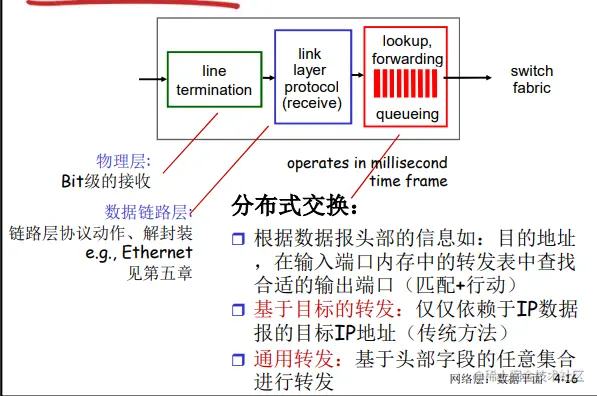 - 转发:从输入到输出链路交换数据报-根据路由表进行分组的==转发==