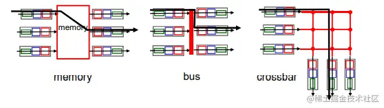 - 数据报通过共享总线,从输入端 口转发到输出端口