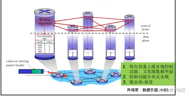 每个路由器上都有实现路由算法元件(它们之间需要相互交 互)- 形成传统IP实现方式的控制平面