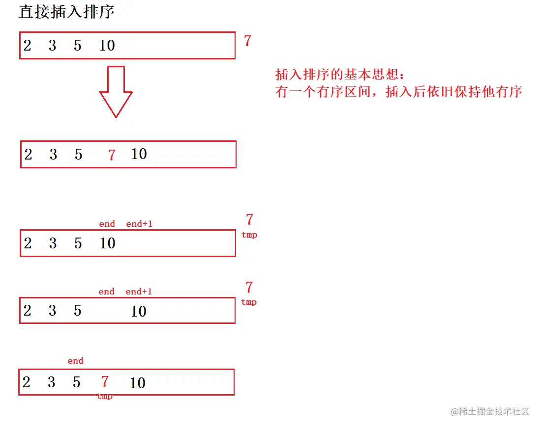 我们从下标为0的开始往后,让最后一个数的下标为end,因此每次插入进来的值得下标为end+1.我们定义一个tmp,让tmp等于a[end+1],然后让tmp依次由后向前遍历这个数组进行比较,如果遇到大于自己的数字,就让那个数字的下标往后挪动一位,即a[end+1] = a[end],每比较一个数让end--,如果tmp遇到比自己小的数字,此时tmp就排在这个数字的后面,即a[end+1] = tmp即可。